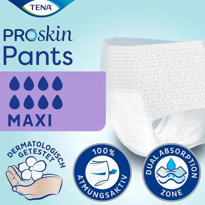 Inkontinenz ist weit verbreitet. Allein in Deutschland leiden 7 bis 8 Millionen Menschen an unkontrolliertem Harnverlust. TENA® entwickelt und optimiert seit über 50 Jahren zuverlässige Hygieneprodukte für verschiedenste Bedürfnisse bei Harninkontinenz. TENA® Pants Maxi Einweghosen wurden gezielt für Frauen und Männer mit starker Blasenschwäche konzipiert. Die weichen Slips mit bequemer, körpernaher Passform bieten sicheren Dreifachschutz vor Auslaufen, Gerüchen und Feuchtigkeit. Dank farbiger Markierung am Hüftbund sind Vorder- und Rückseite sofort erkennbar und ermöglichen ein einfaches Anlegen der Einwegpants. Mit aufreißbaren Seitennähten für einfaches Ausziehen nach der Verwendung.