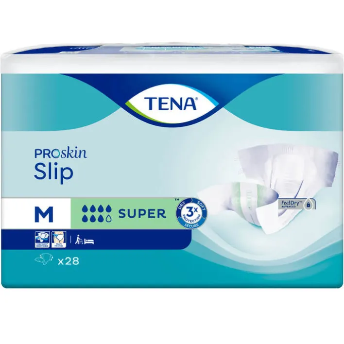 TENA Slip Super ist ein All-in-One-Inkontinenzprodukt, das sich für mobil eingeschränkte und bettlägerige Menschen mit starkem Urinverlust eignet. Die Einweg-Inkontinenzhose garantiert dank verstellbarer Laschen perfekten Sitz, sicheren Auslaufschutz und hohen Tragekomfort. Die FeelDry Advanced™-Technologie hält die Haut trocken, da die auslaufende Flüssigkeit schnell von der Oberfläche weggezogen wird. Der stark absorbierende Kern schließt selbst größere Mengen Urin verlässlich ein, während das atmungsaktive ConfioAir™-Rückenpanel die Haut atmen lässt. Diese Eigenschaften unterstützen die natürliche Hautgesundheit und sorgen für Wohlbefinden beim Träger. Der wirksame Geruchsneutralisierer verhindert unangenehme Gerüche und bewahrt das Frischegefühl.
