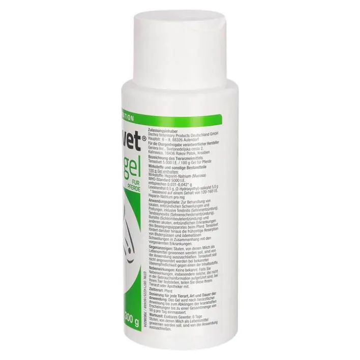 Anwendungsgebiete: Zur Behandlung von lokalen, entzündlichen Schwellungen und Prellungen, inklusive Tendinitis(Sehnenentzündung), Tendosynovitis (Sehnenscheidenentzündung), Bursitis (Schleimbeutelentzündung) und anderen akuten, entzündlichen Erkrankungen des Bewegungsapparates beim Pferd. Tensolvet fördert darüber hinaus die frühzeitige Resorption von Blutergüssen und ödematösen Schwellungen in Zusammenhang mit den vorgenannten Erkrankungen.