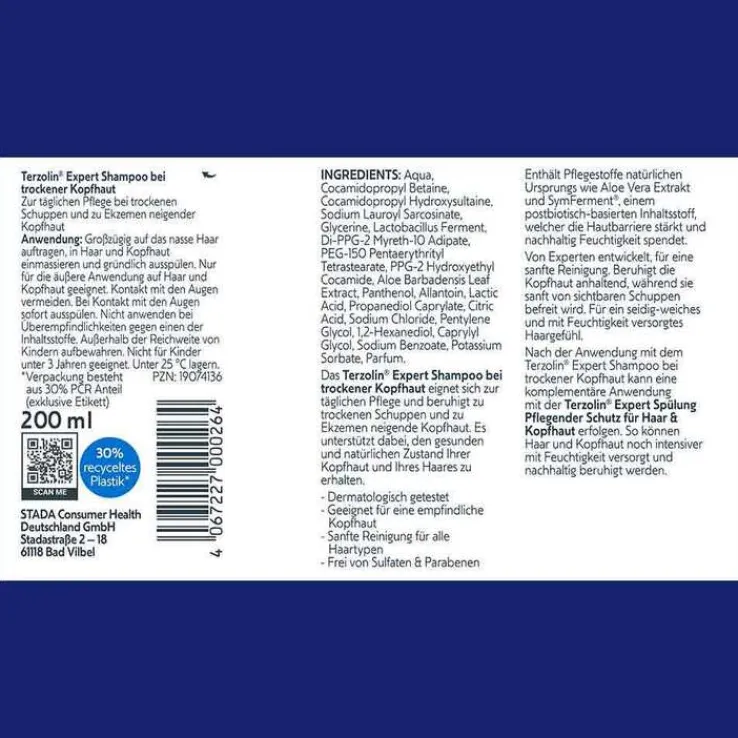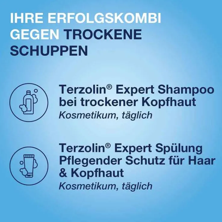 Das Terzolin Expert Shampoo bei trockener Kopfhaut spendet Feuchtigkeit bei trockenen, rieselnden Schuppen. Es enthält den innovativen Inhaltsstoff SymFerment, welcher die Haut mit wichtigen Nährstoffen versorgt. Dadurch wird nachhaltig die Hautbarriere gestärkt. Eine Anwendung des Shampoos in Kombination mit der Terzolin Expert Spülung Pflegender Schutz für Haar und Kopfhaut wird empfohlen.
