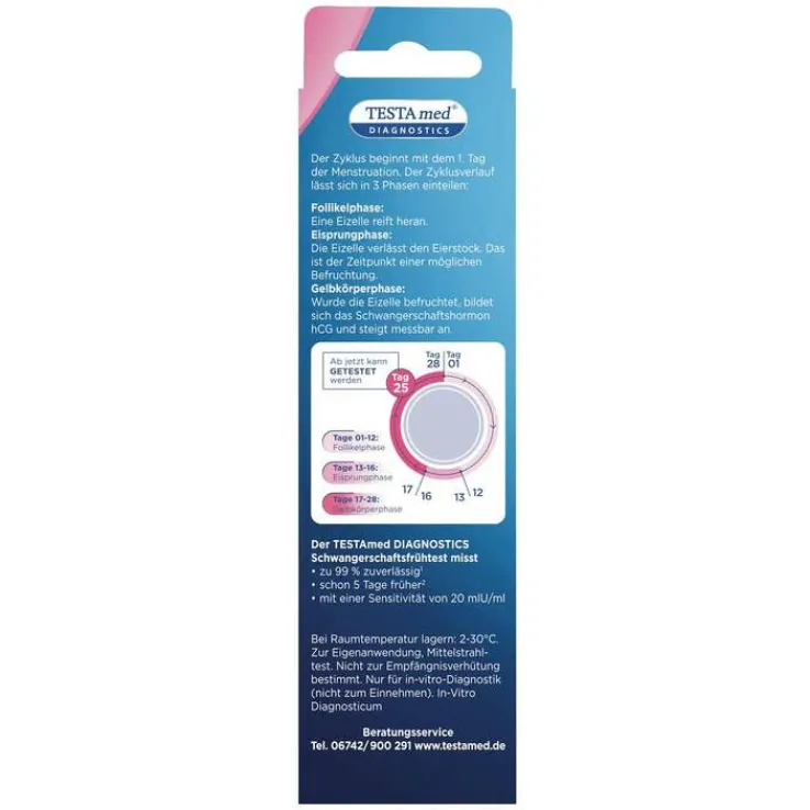 Der TESTAmed® DIAGNOSTICS Schwangerschafts FRÜHTEST weist das Hormon hCG schon ab einer Konzentration von 20 mIU/ml nach. Er ist 5 Tage vor dem Ausbleiben der Periode anwendbar 1 und ab dem Tag der Fälligkeit über 99% zuverlässig. Der Test erfüllt höchste Messgenauigkeit nach der ISO-Norm 13485:2016.