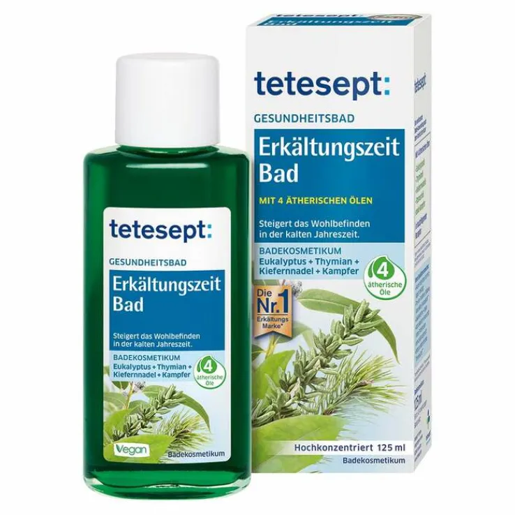 Tetesept Erkältungszeit Bad ist ein wohltuendes Bade-Kosmetikum für Körper und Atemwege speziell in der kalten Jahreszeit. Das warme Bad fördert die Durchblutung, entspannt den Körper und lässt Sie frei durchatmen.