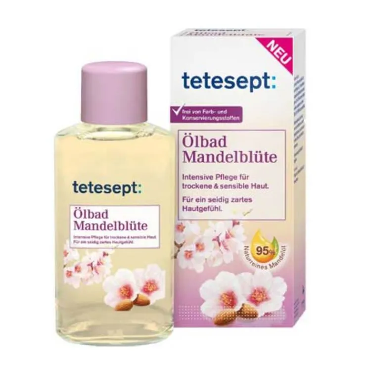 tetesept Mandelblüten Ölbad ist ein hautgesundheitsförderndes Wohlfühlbad mit hochwertigem Mandelöl zur intensiven Pflege Ihrer Haut.
