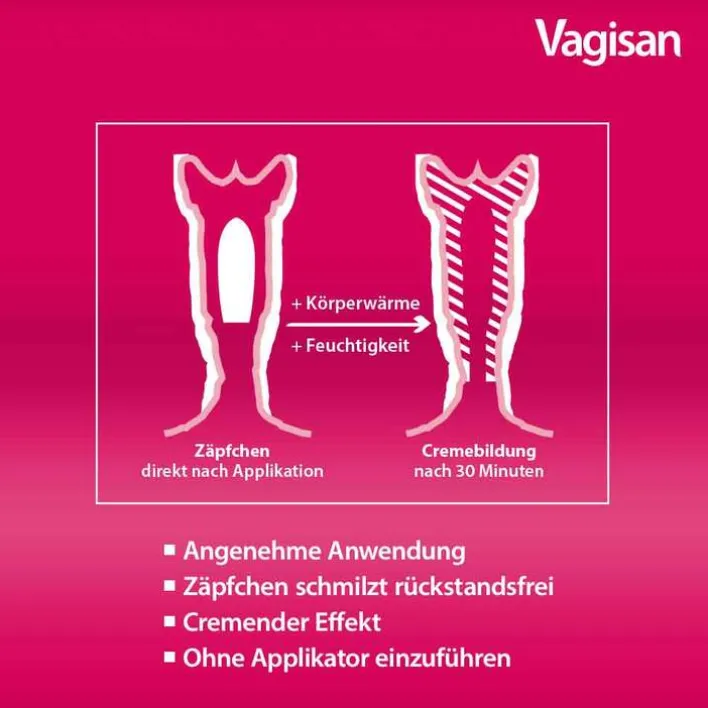 - Cremiges Zäpfchen statt trockener Tablette: schmilzt in der Scheide, bildet eine Creme und hinterlässt keine ungelösten Rückstände
