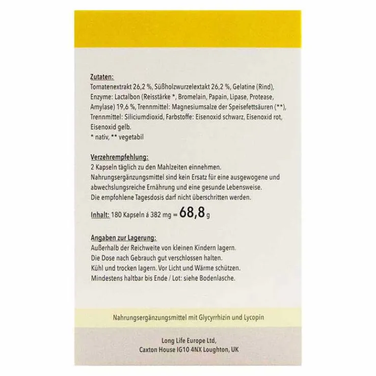 Tomatenextrakt 23,6% (*), Süßholzwurzelextrakt 23,6%, Gelantine (Rind), Lactalbon 19,7% (**), Trennmittel: Magnesiumsalze der Speisefettsäuren (***), Trennmittel: Siliciumdioxid, Farbstoffe: Eisenoxid schwarz, Eisenoxid rot, Eisenoxid gelb.