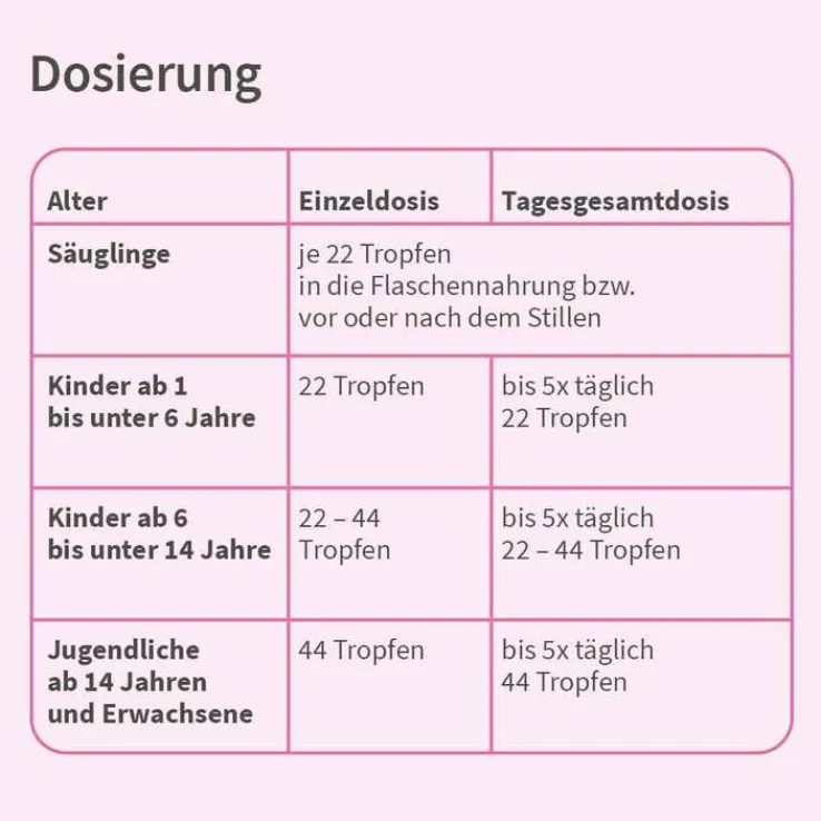 Einzeldosis: 22 Tropfen (entspr. 1 ml), bis 5-mal täglich