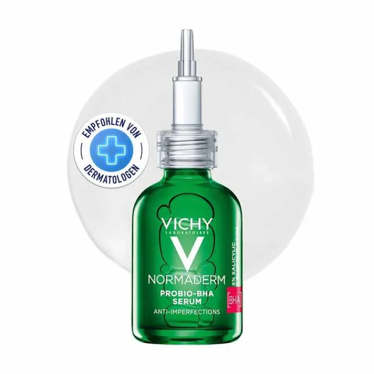 Das schnell einziehende Normaderm Probio-BHA Anti-Unreinheiten Serum von Vichy ist ein zugleich sanftes wie hochkonzentriertes Akne Serum, das hormonell bedingte Unreinheiten mildert. Dafür enthält es sowohl Salicyl- als auch Glykolsäure, welche Pickeln und Mitessern entgegenwirken und gleichzeitig das Hautbild verbessern. Darüber hinaus werden die Poren verfeinert und die Produktion von Talg reguliert. Gleichzeitig spendet das Serum der Haut Feuchtigkeit.