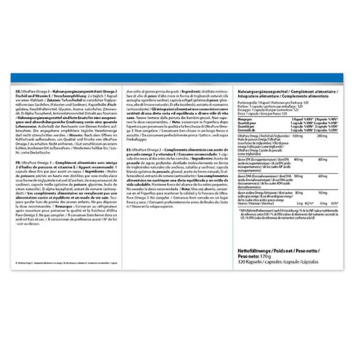 Ultrapure Omega 3 ist ein Nahrungsergänzungsmittel. Das enthaltene hochwertige Omega 3 Fischöl ist reich an EPA (400 mg pro Kapsel) und DHA (300 mg pro Kapsel). Omega 3 trägt zu einer normalen Herzfunktion, einer normalen Hirnfunktion, eines normalen Triglyceridspiegels und zu einer normalen Sehkraft bei.*