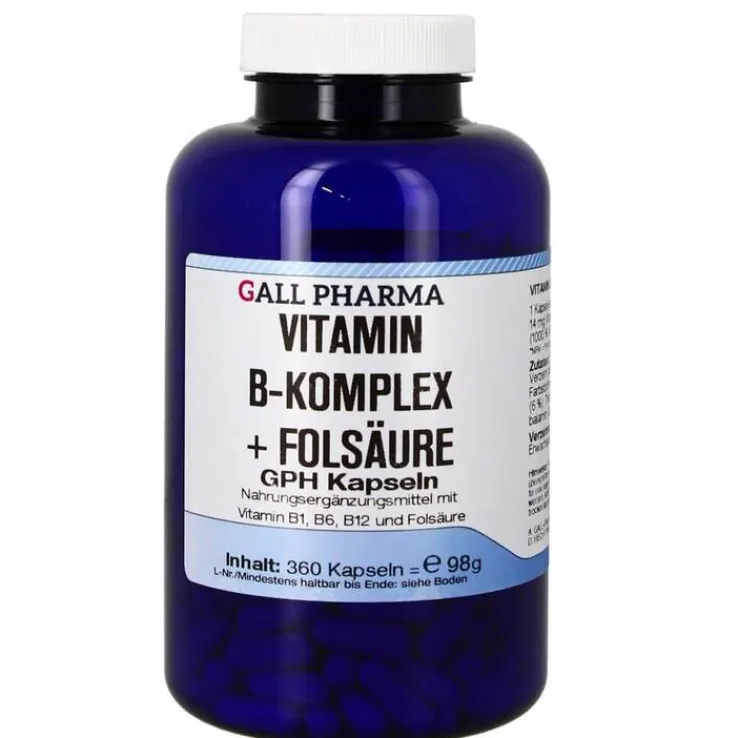 Vitamin B-Komplex + Folsäure GPH Kapseln enthalten 1,4 mg Vitamin B1 (Thiaminhydrochlorid), 2 mg Vitamin B6 (Pyridoxinhydrochlorid), 3 µg Vitamin B12 (Cyancobalamin) und 300 µg Folsäure in drei Hartgelatinekapseln. Die Gruppe der B-Vitamine wird auf Grund ihrer Wasserlöslichkeit im Körper nicht gespeichert und sollte durch die Nahrung oder Ergänzungen ausreichend zugeführt werden.