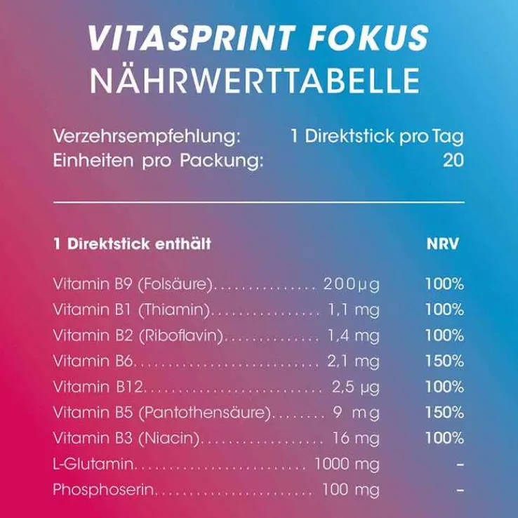 - bleiben Sie konzentriert: Vitasprint Fokus ist Ihr Begleiter im hektischen Alltag oder Zeiten intensiven Arbeiten und Lernens*