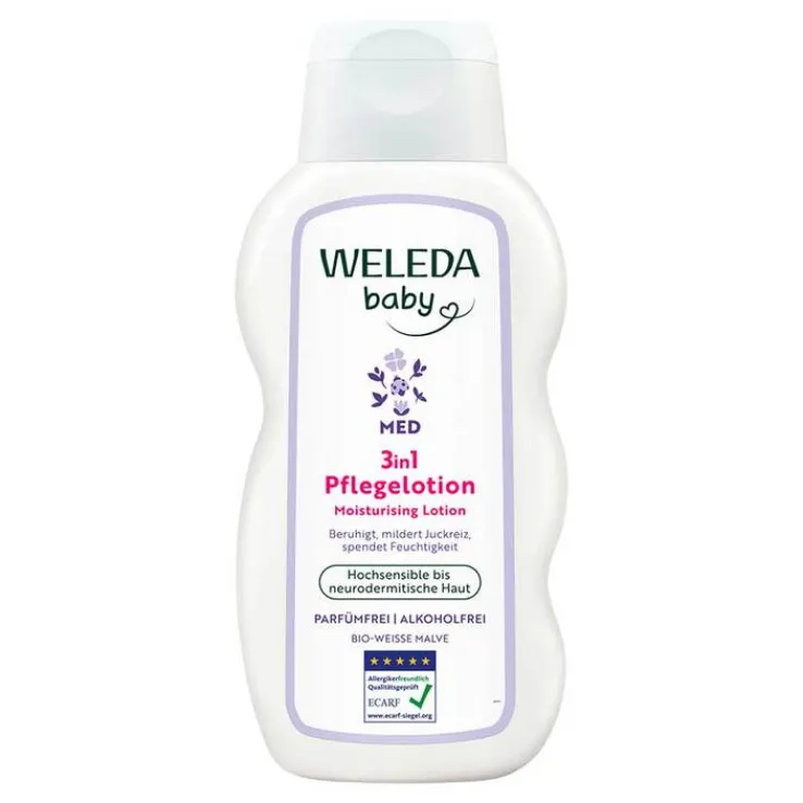 Schenken Sie der hochsensiblen bis neurodermitischen Haut Ihres Babys mit der Med 3in1 Pflegelotion weiße Malve von Weleda Baby verwöhnende Feuchtigkeit! Ihre Formel mit wertvollen Inhaltsstoffen wie Bio-Weisse Malve, Bio-Nachtkerzenöl und Extrakt aus Mondo Graswurzel beruhigt die Haut, schützt und stärkt die Hautbarriere. Gleichzeitig reduziert sie Rötungen und mindert Juckreiz. Die Pflegelotion zieht schnell ein und klebt nicht.