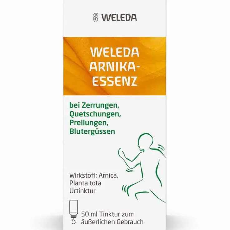 Weleda Arnika-Essenz Wirkstoff: Arnica, Planta tota Urtinktur. Warnhinweis: Enthält 36 Vol.-% Alkohol. Anwendungsgebiete: Gemäß der anthroposophischen Menschen- und Naturerkenntnis. Dazu gehören: Anregung und Harmonisierung der Stoffwechsel- und Formprozesse bei Gewebs- und Organschädigungen, besonders nach mechanischen Einwirkungen und bei Störungen der Blutversorgung; stumpfe Verletzungen aller Art wie Zerrungen, Quetschungen, Prellungen, Blutergüsse. Tinktur zum äußerlichen Gebrauch. Zu Risiken und Nebenwirkungen lesen Sie die Packungsbeilage und fragen Sie Ihre Ärztin, Ihren Arzt oder in Ihrer Apotheke. Weleda AG, Schwäbisch Gmünd
