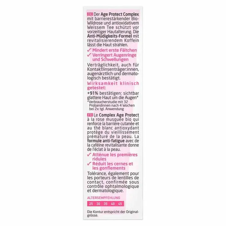 Der Age Protect Complex mit barrierestärkender Bio-Wildrose und antioxidativem Weissem Tee schützt vor vorzeitiger Hautalterung.