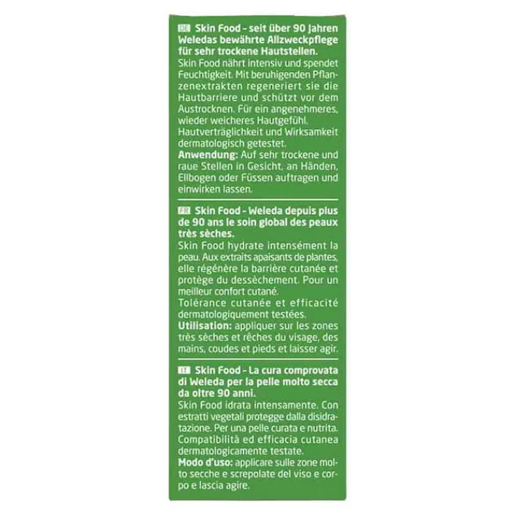 Weleda Skin Food ist eine natürliche Basispflege für die ganze Familie – besonders bei trockener, rauer und spröder Haut. Die Komposition mit Auszügen aus Stiefmütterchen, Kamillen- und Calendulablüten sind hautberuhigend. Schon seit 90 Jahren vertrauen Weleda Kunden diesem Klassiker – für glatte und zarte Haut.