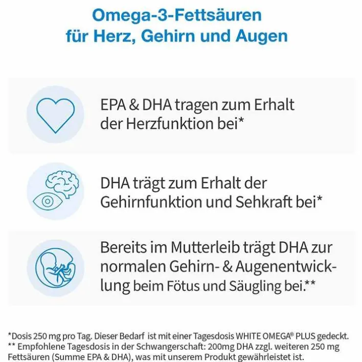 * DHA trägt zur Erhaltung einer normalen Gehirnfunktion bei. Die positive Wirkung setzt bei einer täglichen Aufnahme von 250 mg DHA ein. DHA trägt zur Erhaltung normaler Sehkraft bei. Die positive Wirkung setzt bei einer täglichen Aufnahme von 250 mg DHA ein. EPA und DHA tragen zu einer normalen Herzfunktion bei. Die positive Wirkung setzt bei einer täglichen Aufnahme von 250 mg EPA und DHA ein. DHA und EPA tragen zu einem normalen Blutdruck bei. Die positive Wirkung setzt bei einer täglichen Aufnahme von 300 mg EPA und DHA ein. Die Aufnahme von DHA durch die Mutter trägt zur normalen Entwicklung der Augen des Fötus und des gestillten Säuglings bei (der positive Effekt setzt ein, wenn 0,2 g DHA plus die empfohlene tägliche Zufuhr von Omega-3-Fettsäuren (EPA+DHA) für Erwachsene, die 0,25 g pro Tag beträgt, eingenommen werden). Die Aufnahme von DHA (Docosahexaensäure) trägt zur normalen Entwicklung der Sehkraft bei Säuglingen bis zum Alter von 12 Monaten bei. Die positive Wirkung bei Säuglingen stellt sich bei einer täglichen Aufnahme von 100 mg DHA ein. Die mütterliche Zufuhr von DHA trägt zur normalen Entwicklung des Gehirns des Fötus und des gestillten Säuglings bei (der positive Effekt stellt sich ein, wenn 0,2 g DHA plus die empfohlene tägliche Zufuhr von Omega-3-Fettsäuren (EPA+DHA für Erwachsene, d.h. 0,25 g pro Tag) eingenommen werden).