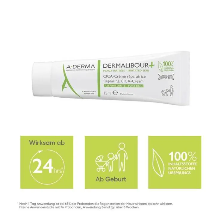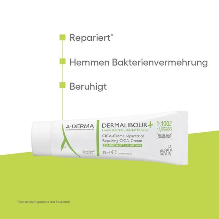 Die A-Derma Dermalibour + Cica repariernde Creme sorgt für sofortige Hautberuhigung und unterstützt eine schnelle Hautregeneration. Die Irritationen werden ab der ersten Anwendung beseitigt und das Gleichgewicht der Haut wiederhergestellt. Die Textur der Creme ist nicht fettend, nicht klebend und hinterlässt keine weißen Flecken. Die A-Derma Dermalibour + Cica repariernde Creme ist nicht komedogen und verfügt über eine hohe Wasserbeständigkeit.
