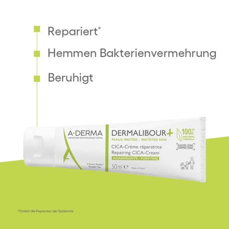 Die A-Derma Dermalibour + Cica repariernde Creme sorgt für sofortige Hautberuhigung und unterstützt eine schnelle Hautregeneration. Die Irritationen werden ab der ersten Anwendung beseitigt und das Gleichgewicht der Haut wiederhergestellt. Die Textur der Creme ist nicht fettend, nicht klebend und hinterlässt keine weißen Flecken. Die A-Derma Dermalibour + Cica repariernde Creme ist nicht komedogen und verfügt über eine hohe Wasserbeständigkeit.