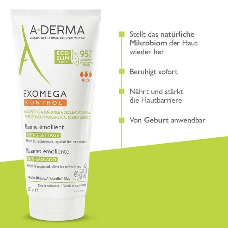 A-Derma Exomega Control Balsam ist ein natürlicher rückfettender Anti-Juckreiz-Balsam. Er mildert Trockenheit, Rötungen und Irritationen und reduziert den Juckreiz¹ um 95% bei trockener, zu Neurodermitis neigender Haut.