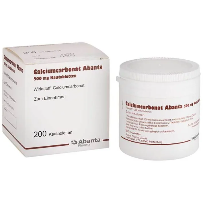 Calciumcarbonat Abanta 500 mg Kautabletten. Wirkstoff: Calciumcarbonat. Anwendungsgebiet: Zur symptomatischen Therapie bei Sodbrennen und säurebedingten Magenbeschwerden. Warnhinweise: enthält Lactose. Apothekenpflichtig. Zu Risiken und Nebenwirkungen lesen Sie die Packungsbeilage und fragen Sie Ihre Ärztin, Ihren Arzt oder in Ihrer Apotheke. Abanta Pharma GmbH