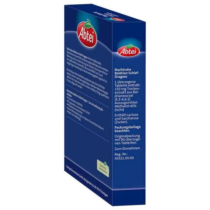 Abtei Nachtruhe Baldrian Schlaf-Dragees Anwendungsgebiete: Nachtruhe Baldrian Schlaf-Dragees sind ein traditionelles pflanzliches Arzneimittel zur Besserung des Befindens bei nervlicher Belastung und zur Unterstützung des Schlafes. Das Arzneimittel ist ein traditionelles Arzneimittel, das ausschließlich auf Grund langjähriger Anwendung für das Anwendungsgebiet registriert ist. Warnhinweise: Enthält Lactose und Sucrose (Zucker). Packungsbeilage beachten. Zu Risiken und Nebenwirkungen lesen Sie die Packungsbeilage und fragen Sie Ihre Ärztin, Ihren Arzt oder in Ihrer Apotheke.