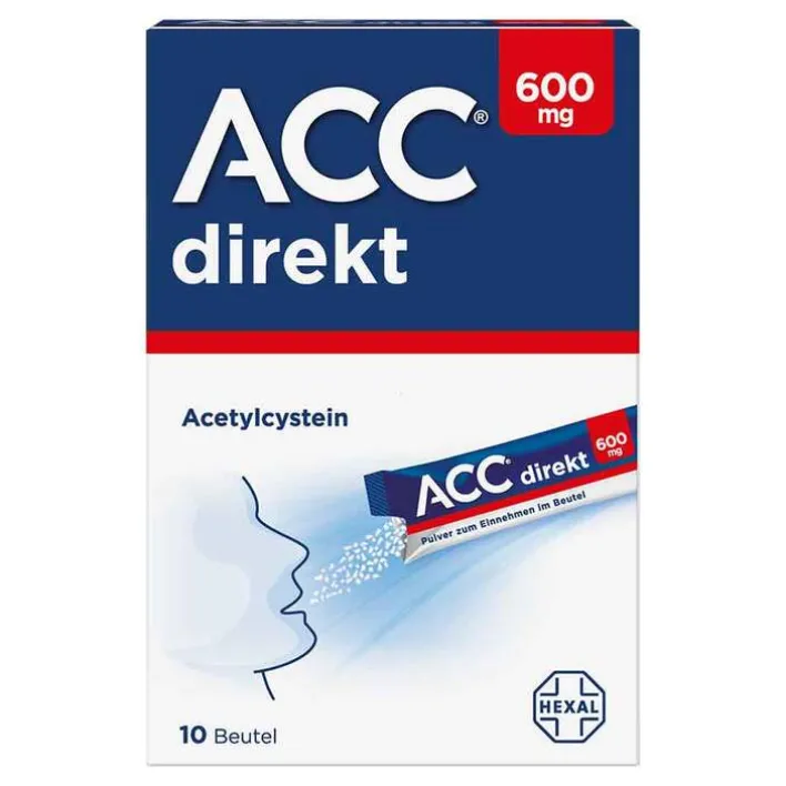 ACC® direkt 600 mg Pulver zum Einnehmen im Beutel, Wirkstoff: Acetylcystein. Anwendungsgebiet: Zur Schleimlösung und zum erleichterten Abhusten bei Atemwegserkrankungen mit zähem Schleim. Dieses Arzneimittel darf nur bei Erwachsenen und Jugendlichen ab 14 Jahre angewendet werden. Warnhinweis: Enthält Sorbitol und Aspartam. Nicht kauen. Zu Risiken und Nebenwirkungen lesen Sie die Packungsbeilage und fragen Sie Ihre Ärztin, Ihren Arzt oder in Ihrer Apotheke! Mat.-Nr.: 2/51016573 Stand: April 2024 Hexal AG, 83607 Holzkirchen, www.hexal.de