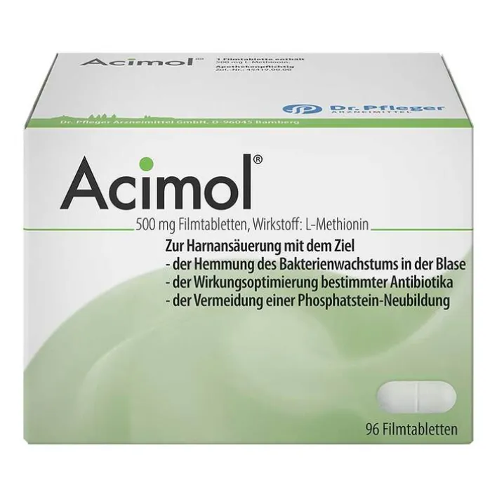 Acimol® 500 mg Filmtabletten. Anw.: Zur Harnansäuerung mit dem therapeutischen Ziel: Optimierung der Wirkung von Antibiotika mit Wirkungsoptimum im sauren Urin, Vermeidung der Steinneubildung bei Phosphatsteinen, Hemmung des Bakteriumwachstums. Zu Risiken und Nebenwirkungen lesen Sie die Packungsbeilage und fragen Sie Ihre Ärztin, Ihren Arzt oder in Ihrer Apotheke. (ACI/060513/LW).