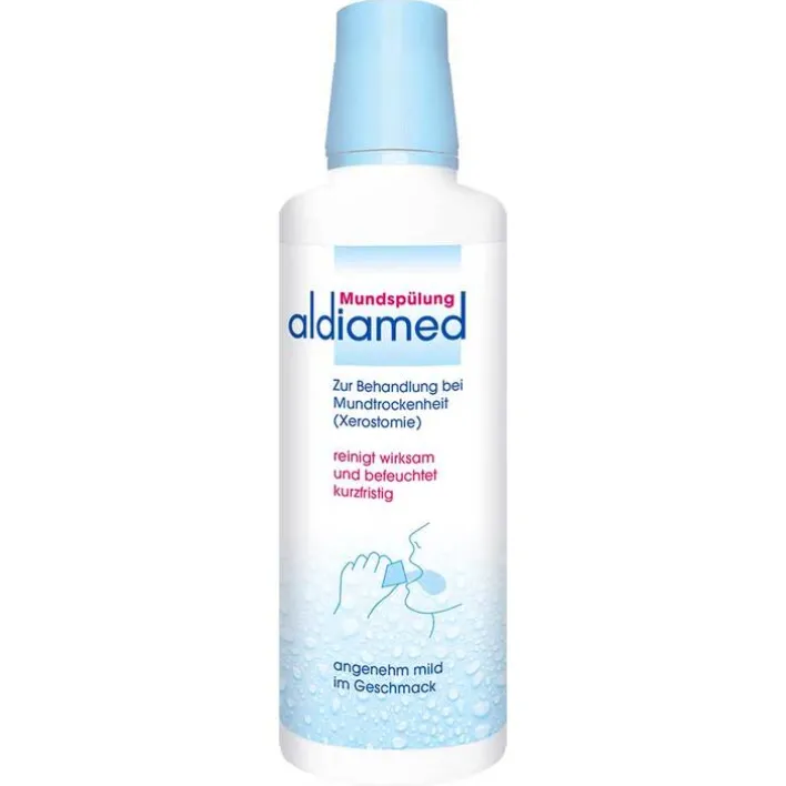 Aldiamed Mundspülung, zur Behandlung bei Mundtrockenheit, reinigt wirksam und befeuchtet kurzfristig. Die Mundspülung unterstützt den natürlichen Schutz in der Mundhöhle.
