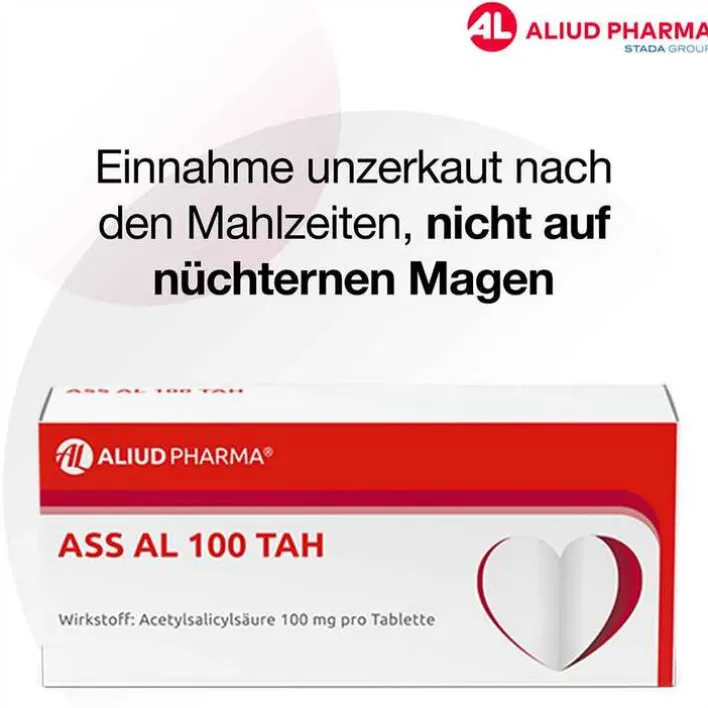 - Zur Vorbeugung vorübergehender Mangeldurchblutung im Gehrin (TIA) und Hirninfarkten, nachdem Vorläuferstadien aufgetreten sind: 1 Tablette ASS AL 100 TAH (entsprechend 100 mg Acetylsalicylsäure pro Tag).