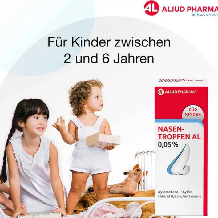 Bei einer verstopften Nase können Nasentropfen mit dem Wirkstoff Xylometazolin die lästigen Beschwerden wirksam lindern und die Nase wieder frei machen. Eigens für Kinder steht mit NASENTROPFEN AL 0,05 % ein Arzneimittel zur Verfügung, das den bewährten Wirkstoff Xylometazolin in geringer Dosierung enthält. Der Inhaltsstoff kann ein Abschwellen der Nasenschleimhaut bewirken und so das Abfließen von zähem Schleim erleichtern – damit Ihr Kind wieder befreit durchatmen kann. NASENTROPFEN AL 0,05 % sind zur Anwendung bei Kindern zwischen 2 und 6 Jahren geeignet.