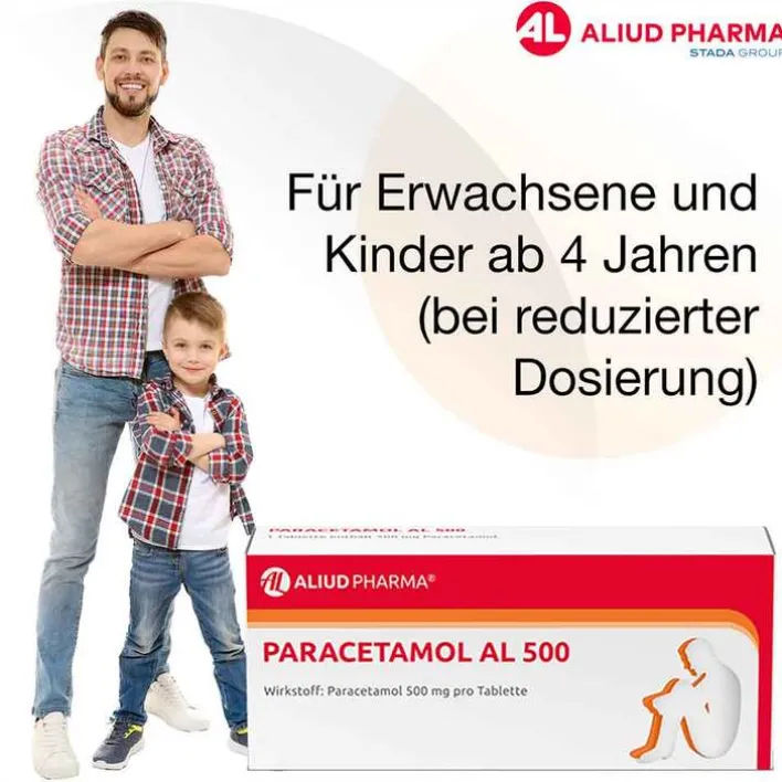 Paracetamol AL 500 Zur Anwendung bei Kindern ab 4 Jahren, Jugendlichen und Erwachsenen. Paracetamol 500 mg pro Tablette Wirkstoff: Paracetamol. Zur symptomatischen Behandlung von leichten bis mäßig starken Schmerzen (wie Kopfschmerzen, Zahnschmerzen, Regelschmerzen) und/oder Fieber. Hinweis: Bei Schmerzen oder Fieber ohne ärztlichen Rat nicht länger anwenden als in der Packungsbeilage vorgegeben! Zu Risiken und Nebenwirkungen lesen Sie die Packungsbeilage und fragen Sie Ihre Ärztin, Ihren Arzt oder in Ihrer Apotheke. ALIUD PHARMA GmbH, Postfach 1380, 89146 Laichingen Stand: Dezember 2024