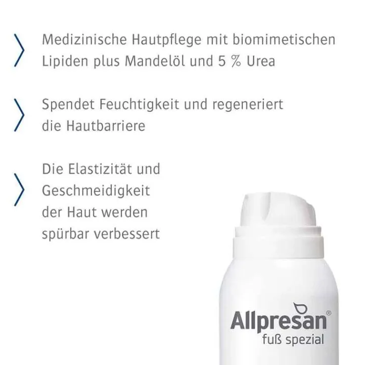 Die Allpresan Fuß spezial 2 Original Schaum-Creme für trockene Fußhaut glättet die Haut und macht sie wieder geschmeidig. Zudem mindert sie Druckstellen und beugt ihrer Entstehung vor.Die natürliche Schutzfunktion der Haut wird unterstützt. Die Schaum-Creme enthält 5% Urea und Aloe Vera.