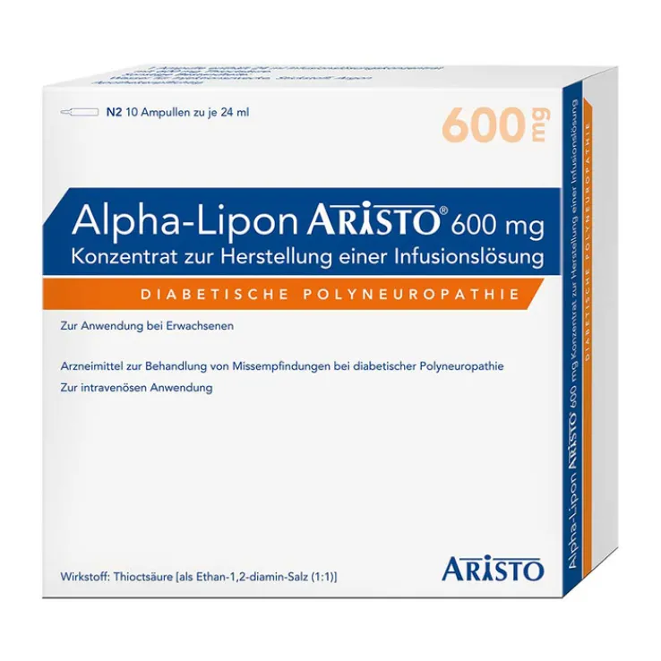 Alpha-Lipon Aristo® 600 mg Konzentrat zur Herstellung einer Infusionslösung (apothekenpflichtig) Wirkstoff: Thioctsäure, Ethan-1,2-diamin-Salz (1:1)/Thioctsäure Missempfindungen bei diabetischer Nervenschädigung (Polyneuropathie). Zu Risiken und Nebenwirkungen lesen Sie die Packungsbeilage und fragen Sie Ihre Ärztin, Ihren Arzt oder in Ihrer Apotheke. -Filmtabletten: Enthält Lactose. Packungsbeilage beachten. (Stand September 2021). Aristo Pharma GmbH, Wallenroder Straße 8-10, 13435 Berlin.