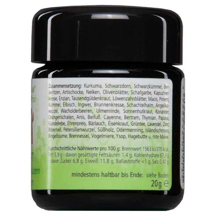 Kurkuma, Schwarzdron, Schwarzkümmel, Berberitzen, Artischocke, Nelken, Olivenblätter, Schafgarbe, Kapuzinerkresse, Enzian, Tausendgüldenkraut, Löwenzahnblätter, Macis, Piment, Kümmel, Eibisch, Ingwer, Brunnenkresse, Schachtelhalm, Angelikawurzel, Wacholderbeeren, Ulmenrinde, Sonnenhutkraut, Koriander, Orangenschalen, Anis, Beifuß, Cayenne, Bertram, Thymian, Papaya, Gundelrebe, Ehrenpreis, Bärlauch, Eisenkraut, Grüntee, Lavendel, Zimt, Bibernell, Pertersilienwurzel, Süßholz, Odermenning, Isländischmoos, Ringelblume, Brennnessel, Vogelmiere, Ysop, Hagebutte und rote Malve.