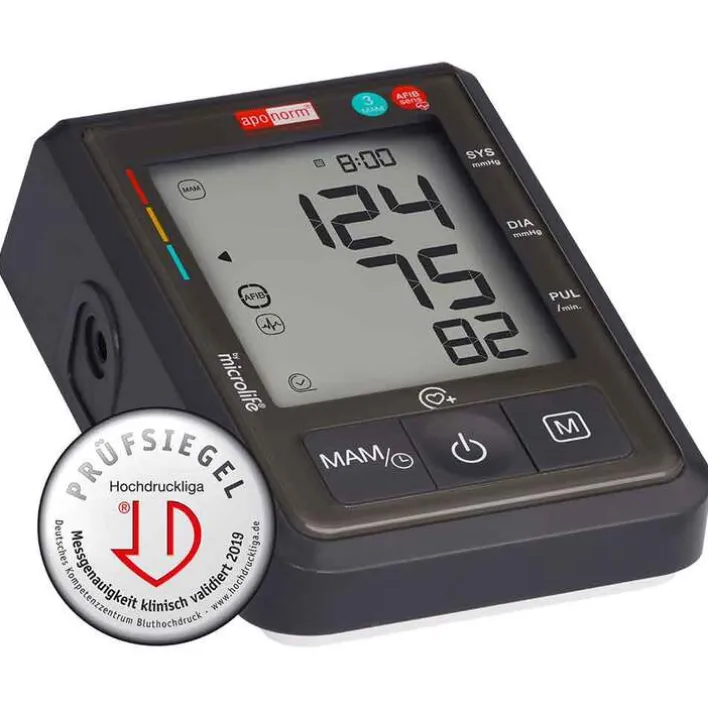 Das Heimtückische an Vorhofflimmern: Es tritt oftmals symptomlos und/ oder nur unregelmäßig auf, sodass es selbst bei sporadischen Besuchen bei der Ärztin/beim Arzt häufig unentdeckt bleibt. Das aponorm® Professionell Control Oberarm-Blutdruckmessgerät ermöglicht es Ihnen durch seine sogenannte Afib-Technologie (Afib = engl. Atrial Fibrillation = deutsch: Vorhofflimmern) bei der normalen, täglichen Blutdruckmessung zu Hause auf Vorhofflimmern zu prüfen. Durch die regelmäßige Anwendung bei der Blutdruckmessung steigt die Chance, Vorhofflimmern rechtzeitig zu erkennen und frühzeitig Maßnahmen dagegen ergreifen zu können.