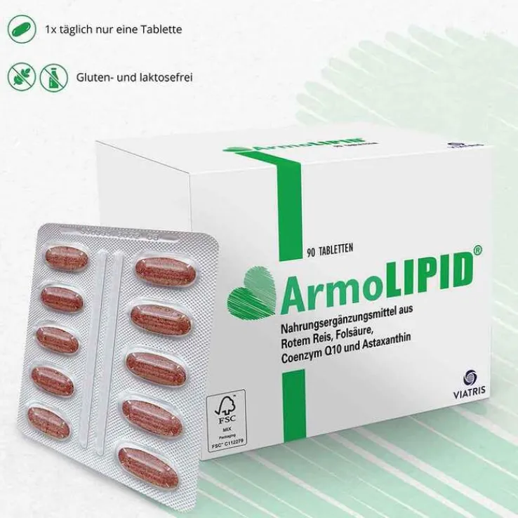 Armolipid ist ein natürliches Nahrungsergänzungsmittel mit rot fermentiertem Reis, Folsäure, Coenzym Q10 und Astaxanthin.