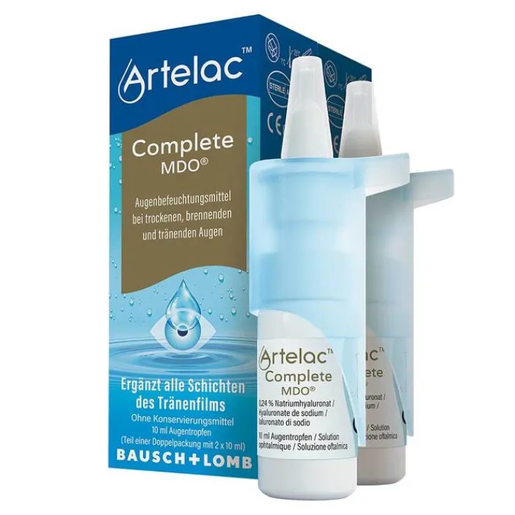 Artelac® Complete MDO® Augentropfen zur Befeuchtung trockener Augen lindern zielgerichtet die Defizite des natürlichen Tränenfilms und die Augenoberfläche ist bereits mit einem Tropfen rundum sicher gut versorgt. Die Augentropfen mit Lipiden schützen den Tränenfilm vor einer vermehrten Verdunstung, der natürliche Feuchtigkeitsspender Hyaluronsäure (0,24 %) und Glycerin binden Feuchtigkeit, das Carbomer befeuchtet und bindet zusätzlich Wasser. Anwender:innen erleben eine umgehende und intensive, langanhaltende Linderung ihrer Symptome.