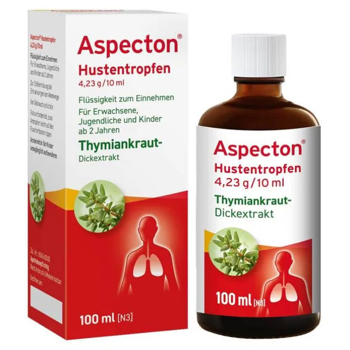 Aspecton Hustentropfen. Wirkstoff: Dickextrakt aus Thymiankraut. Anwendungsgebiete: Zur Besserung der Beschwerden bei Erkältungskrankheiten der Atemwege mit zähflüssigem Schleim, zur Besserung der Beschwerden bei akuter Bronchitis. Hinweise: Enthält Propylenglycol, Eukalyptusöl und Levomenthol. Zu Risiken und Nebenwirkungen lesen Sie die Packungsbeilage und fragen Sie Ihre Ärztin, Ihren Arzt oder in Ihrer Apotheke. Stand: 12/2023