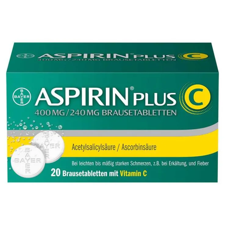 Aspirin® Plus C Wirkstoffe: Acetylsalicylsäure, Ascorbinsäure (Vitamin C) Anwendungsgebiete: Leichte bis mäßig starke Schmerzen wie Kopfschmerzen; Zahnschmerzen; Regelschmerzen; schmerzhafte Beschwerden, die im Rahmen von Erkältungskrankheiten auftreten (z. B. Kopf-, Hals- und Gliederschmerzen); Fieber. Bitte beachten Sie die Angaben für Kinder. Hinweis: Enthält Natriumverbindungen. Packungsbeilage beachten. Bei Schmerzen oder Fieber ohne ärztlichen Rat nicht länger anwenden als in der Packungsbeilage vorgegeben! Zu Risiken und Nebenwirkungen lesen Sie die Packungsbeilage und fragen Sie Ihre Ärztin, Ihren Arzt oder in Ihrer Apotheke.