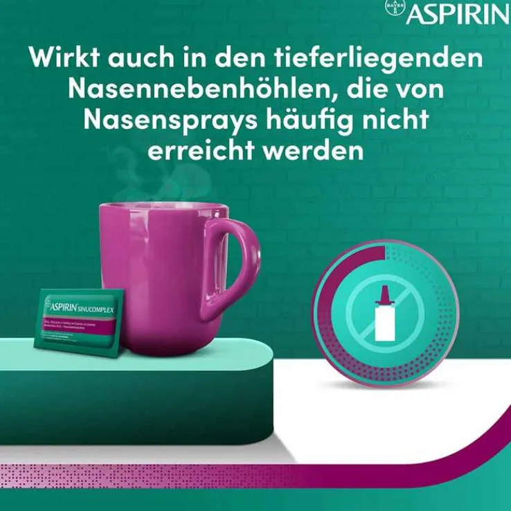 Gleichzeitig können Betroffene dank Aspirin® SinuComplex auf abschwellende Nasensprays verzichten, die bei Nasennebenhöhlenentzündungen häufig eingesetzt werden, dabei jedoch nicht bis in die tieferliegenden Nebenhöhlen gelangen. Aspirin® SinuComplex entfaltet seine abschwellende Wirkung in allen betroffenen Bereichen der Nase und Nebenhöhlen und wirkt damit umfassender als Nasensprays. Die schmerzlindernde Wirkung sowie entzündungshemmende Eigenschaft des Präparates ersparen außerdem die Einnahme weiterer Schmerztabletten. Als Präparat zur Kurzzeitbehandlung der Symptome einer Nasennebenhöhlenentzündung ist Aspirin® SinuComplex darüber hinaus speziell auf die Bedürfnisse von Nasennebenhöhlen-Patienten zugeschnitten. Während sich diese bisher oft mit verschiedenen universellen Erkältungspräparaten zur Linderung einzelner Symptome zufriedengeben mussten, bietet Aspirin® SinuComplex nun eine gezielte Lösung für Betroffene in nur einem Präparat.
