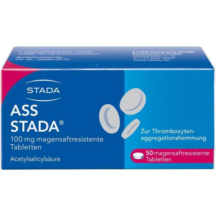 ASS STADA® 100 mg magensaftresistente Tabletten Wirkstoff: Acetylsalicylsäure. Wird angewendet, um das Risiko der Entstehung von Blutgerinnseln zu verringern und damit folgenden Erkrankungen vorzubeugen: weitere Herzinfarkte, weitere vorübergehende Mangeldurchblutung im Gehirn (TIA: transitorisch ischämische Attacke) oder weitere Schlaganfälle, vorausgesetzt Hirnblutungen wurden ausgeschlossen, Probleme des Herz-Kreislauf-Systems bei Patienten mit stabiler oder instabiler Angina pectoris (Schmerzen im Brustbereich). Wird ebenfalls angewendet, um der Entstehung von Blutgerinnseln nach bestimmten Arten von herzchirurgischen Eingriffen zur Erweiterung oder zum Offenhalten der Blutgefäße vorzubeugen. Dieses Arzneimittel eignet sich nicht für Notfallsituationen. Es kann nur zur Vorbeugung eingenommen werden. Zu Risiken und Nebenwirkungen lesen Sie die Packungsbeilage und fragen Sie Ihre Ärztin, Ihren Arzt oder in Ihrer Apotheke. STADA Consumer Health Deutschland GmbH, Stadastraße 2-18, 61118 Bad Vilbel Stand: März 2025