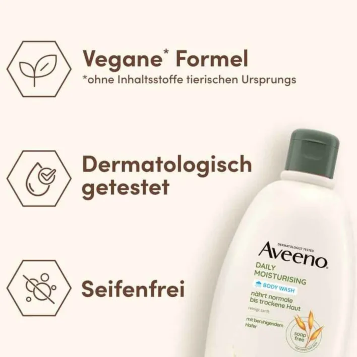 Das vegane, seifenfreie Daily Moisturising Duschgel von Aveeno nährt normale bis trockene Haut und reinigt sanft (wissenschaftlich erwiesen), ohne die Haut auszutrocknen. Es hinterlässt die Haut sauber, beruhigt und genährt.