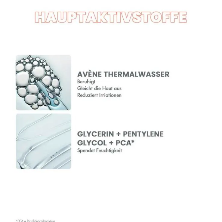 AVENE THERMAL SPRING WATER (AVENE AQUA). GLYCERIN. PENTYLENE GLYCOL. CITRIC ACID. COCO-GLUCOSIDE. FRAGRANCE (PARFUM). PCA. POLYGLYCERYL-4 CAPRATE. POLYGLYCERYL-6 CAPRYLATE. SODIUM BENZOATE. WATER (AQUA).