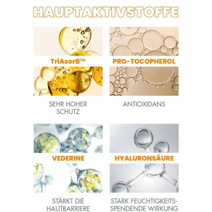[TriAsorB™]: 1. organischer Sonnenfilter, bewahrt die Haut vor UVB- und UVA-Strahlen. Er schützt auch vor dem kurzwelligen blauen Anteil des Tageslichts, dem sogenannten HEV-Blue-Light und bietet somit einen zusätzlichen Schutz vor Hautalterung und Hyperpigmentierung infolge kurzwelligem Blue Light.