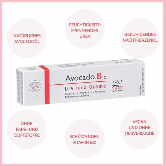 - Vitamin B12 gilt als antioxidativ wirkendes Vitamin, das sich bei Juckreiz und Rötungen bewährt hat. Zusätzlich schenkt es der Avocado.B12 Creme die charakteristische rosa Farbe.