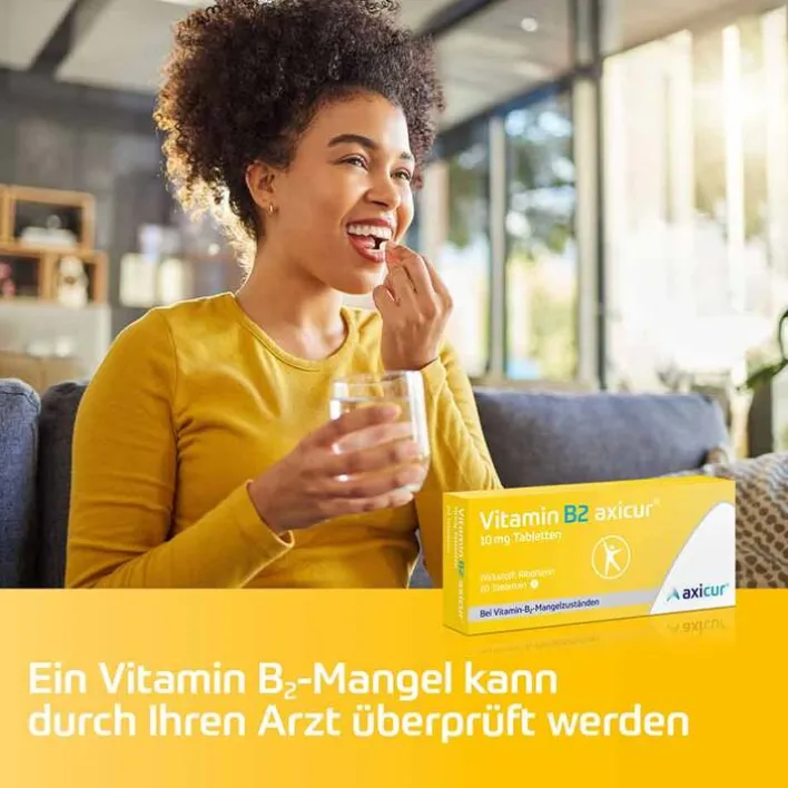 Vitamin B2 axicur® 10 mg Tabletten Wirkstoff: Riboflavin. Anwendungsgebiete: Zur Behandlung von klinischen Vitamin-B 2 -Mangelzuständen, die ernährungsmäßig nicht ausgeglichen werden können. Enthält Lactose. Packungsbeilage beachten. Zu Risiken und Nebenwirkungen lesen Sie die Packungsbeilage und fragen Sie Ihre Ärztin, Ihren Arzt oder in Ihrer Apotheke. axicorp Pharma GmbH, 61381 Friedrichsdorf. Stand: April 2022