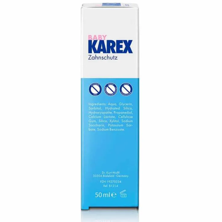 Zum Schutz der empfindlichen Mundhöhle des Babys, enthält die Baby Karex Formel nur die nötigsten Inhaltsstoffe und ist frei von Fluorid, Tensiden und Aromen. Dank der innovativen Wirkformel mit dem Wirkstoffkomplex BioHAP schützt Baby Karex genauso effektiv vor Karies wie herkömmliche fluoridhaltige Zahnpasten und ist bei Verschlucken unbedenklich.