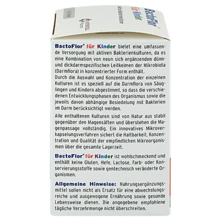 Bactoflor® für Kinder bietet eine umfassende Versorgung mit aktiven Bakterienkulturen, da es eine Kombination von neun sich ergänzenden dünn- und dickdarmspezifischen Leitkulturen der Darmflora in konzentrierter Form enthält.