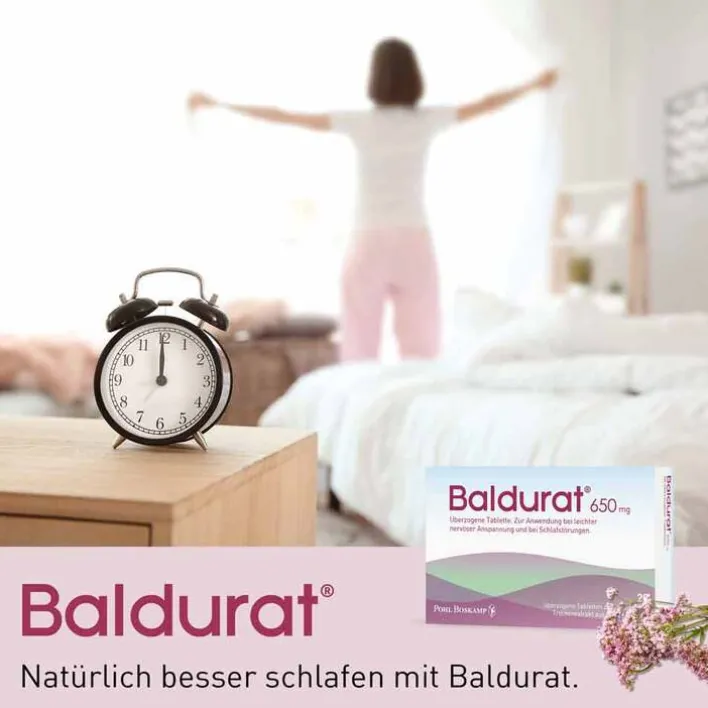 Baldurat®. Wirkstoff: Baldrianwurzel-Trockenextrakt. Anw.: Z. Anw. b. leichter nervöser Anspannung u. b. Schlafstörungen. Enth. Sucrose u. Glucose. Zu Risiken und Nebenwirkungen lesen Sie die Packungsbeilage und fragen Sie Ihre Ärztin, Ihren Arzt oder in Ihrer Apotheke. Pohl-Boskamp, Hohenlockstedt