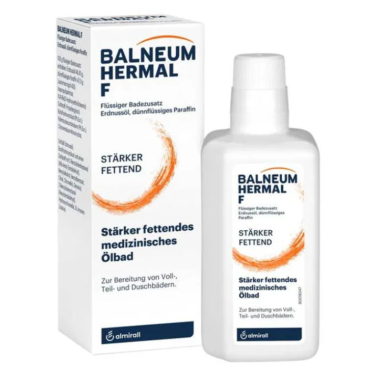 BALNEUM HERMAL F. Zusammensetzung: 100 g enthalten: Arzneilich wirksame Bestandteile: Erdnussöl: 46,45 g, dünnflüssiges Paraffin: 47,0 g. Sonstige Bestandteile: Lauromacrogol 400; Isopropylpalmitat; N,N-Bis(2-Hydroxyethyl)-oleamid; Duftstoff; Propylenglycol; Butylhydroxytoluol (Ph. Eur.); Palmitoylascorbinsäure (Ph. Eur.); Citronensäure-Monohydrat. Anwendungsgebiete: Fettendes medizinisches Ölbad zur Bereitung von Teil-, Voll- und Duschbädern. Zur unterstützenden Behandlung bei trockener, schuppender, juckender und empfindlicher Haut wie z. B. atopisches Ekzem (Neurodermitis), Psoriasis, Ichthyosis. Warnhinweise: Butylhydroxytoluol kann örtlich begrenzt Hautreizungen (z. B. Kontaktdermatitis), Reizungen der Augen und der Schleimhäute hervorrufen. Die im Duftstoff enthaltenen D-Limonen und Linalool können allergische Reaktionen hervorrufen. Stand: November 2021. Almirall HERMAL GmbH • Scholtzstraße 3 • D-21462 Reinbek. www.almirall.de – E-Mail: [email protected]. Zu Risiken und Nebenwirkungen lesen Sie die Packungsbeilage und fragen Sie Ihre Ärztin, Ihren Arzt oder in Ihrer Apotheke.