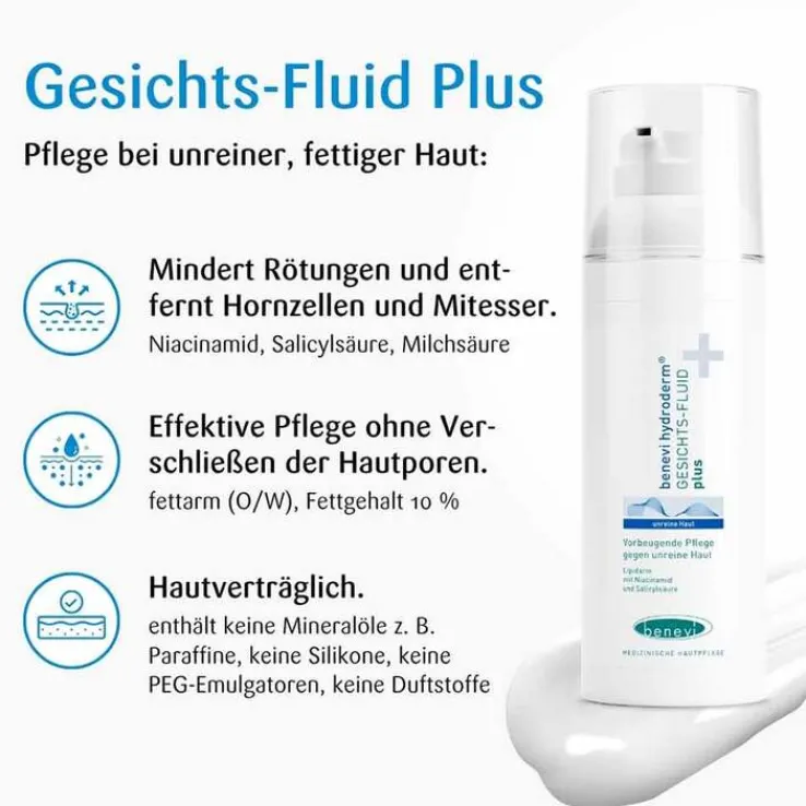 Das Benevi Hydroderm Gesichts-Fluid plus ist eine leichte, fettarme Pflege für unreine Haut, die zu Mitessern, Pickeln und verstopften Poren neigt. Auch unreine Haut braucht Feuchtigkeit – doch viele herkömmliche Cremes sind zu reichhaltig und können neue Unreinheiten fördern. Das nicht komedogene Fluid plus pflegt gezielt, ohne zu fetten oder die Poren zu verstopfen. Salicyl- & Milchsäure sowie Niacinamid helfen, abgestorbene Hautzellen zu lösen, Talg zu regulieren und das Hautbild sichtbar zu verbessern.
